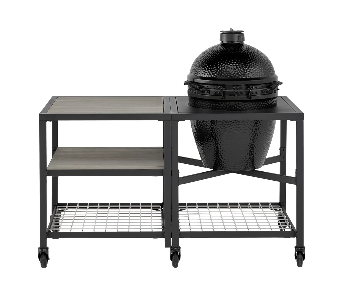 Het pakket is uitgebreid met een EGG Frame en Expansion Frame, een Stainless Steel Grid Insert, twee Acacia Wood Inserts en drie zwenkwielen. Daarmee ontstaat een praktische en stijlvolle buitenkeuken waarin je comfortabel kunt werken. De Dual Zone Deflector Kit en de halve gietijzeren en RVS roosters zorgen ervoor dat je meteen breed inzetbaar bent voor direct en indirect koken.