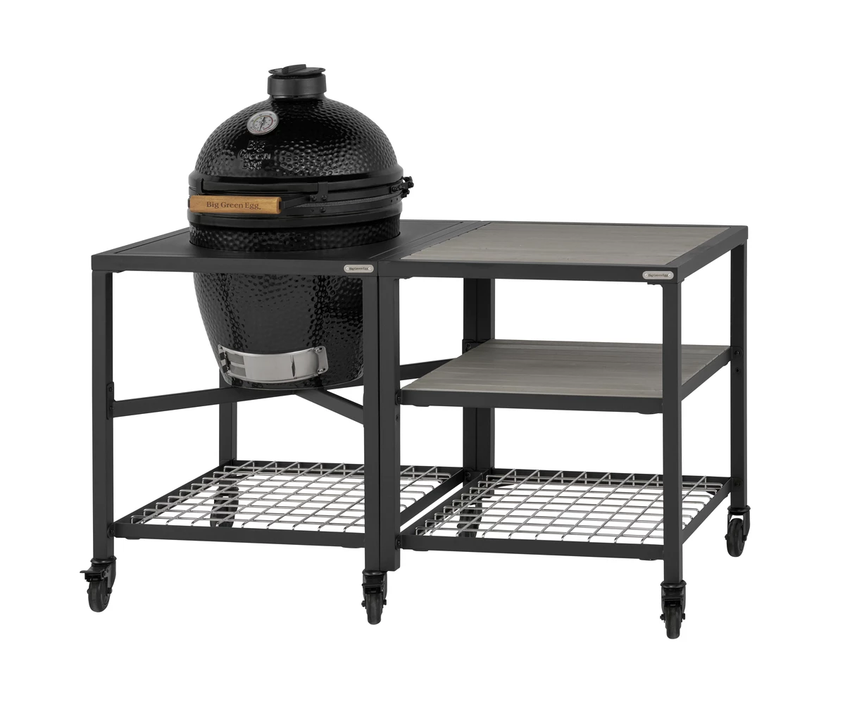 De Big Green Egg The Onyx Large Outdoor Kitchen is een complete buitenkeuken met exclusieve kamado barbecue, EGG Frame, werkruimte en accessoires voor veelzijdig en stijlvol buiten koken.