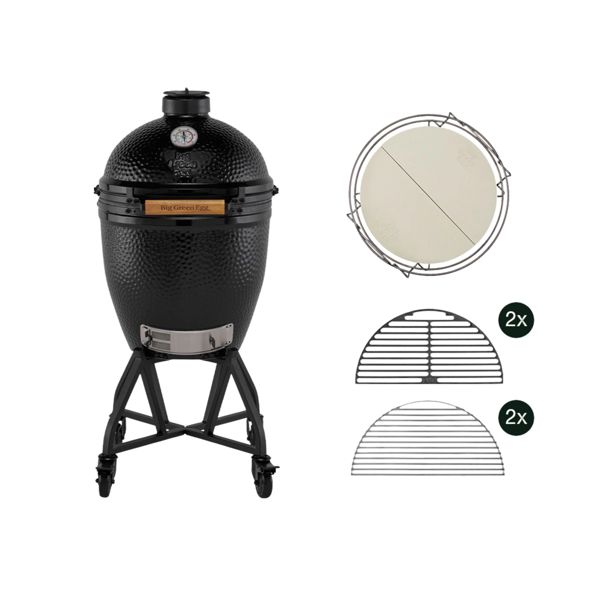 Met de intEGGrated Nest+Handler staat de EGG stabiel en is hij eenvoudig te verplaatsen. De Dual Zone Deflector Kit maakt het mogelijk om verschillende temperatuurzones te creëren, zodat je tegelijk direct en indirect kunt koken. De halve gietijzeren roosters zijn perfect voor krachtig grillwerk, terwijl de halve RVS roosters veelzijdigheid en gebruiksgemak toevoegen.