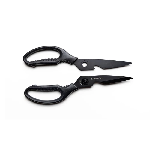 Ontdek de ultieme keukenschaar voor dagelijks gebruik in keuken en buitenkeuken: de Messermeister Pro Series Keukenschaar 23 cm. Dankzij het patent-draaipunt met kogellagers blijven de bladen perfect op elkaar afgestemd, zonder losse schroeven. De 4 mm dikke lemmeten zijn gemaakt van hoogwaardig roestvast koolstofstaal en zwart-titanen gecoat voor extra corrosiebestendigheid.