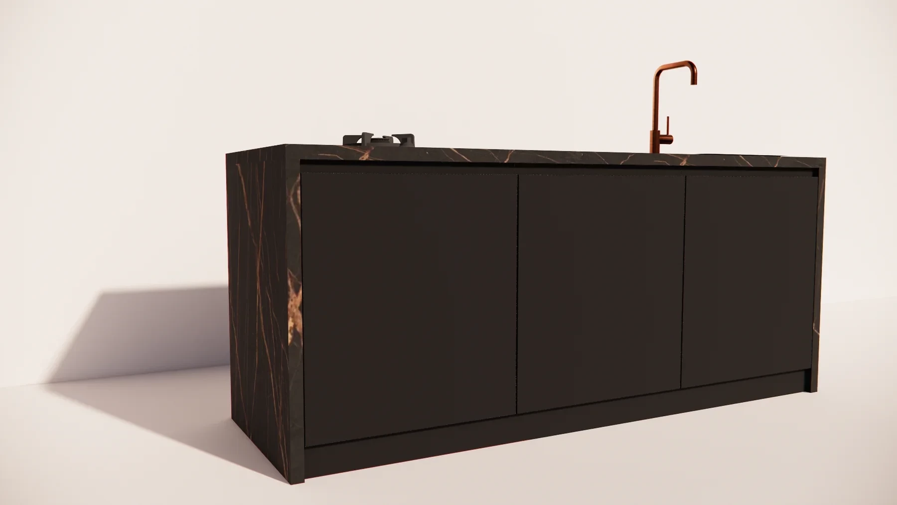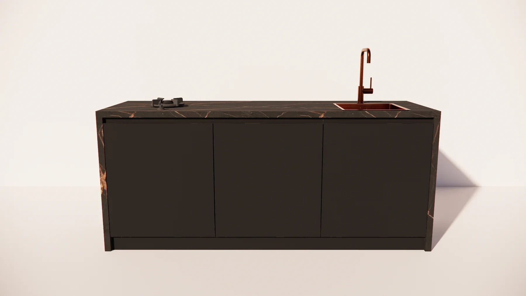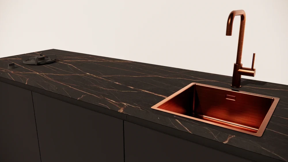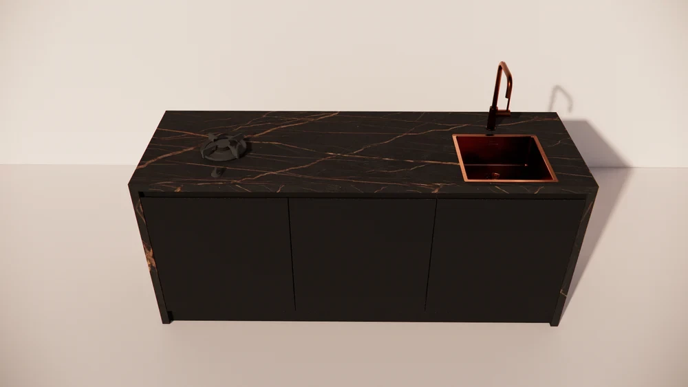 De Pitt Cooking brander is naadloos geïntegreerd in het werkblad en biedt krachtige prestaties in een minimalistische vormgeving. De spoelunit zorgt voor praktisch gemak tijdens het koken en schoonmaken, terwijl het Laurent werkblad een luxueuze uitstraling geeft met zijn donkere, marmerachtige structuur.