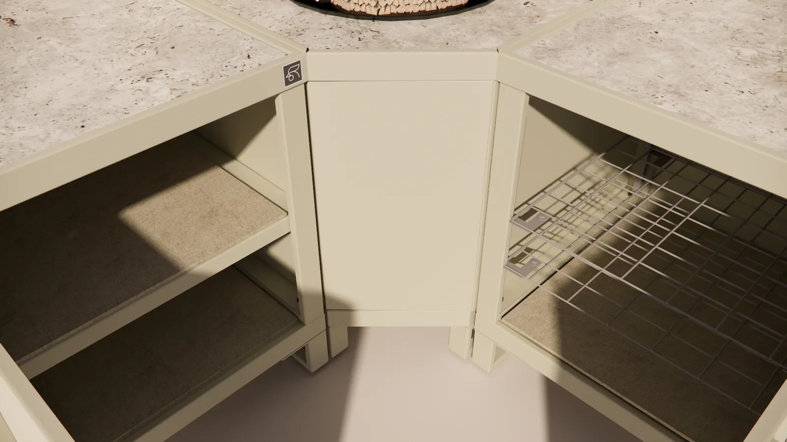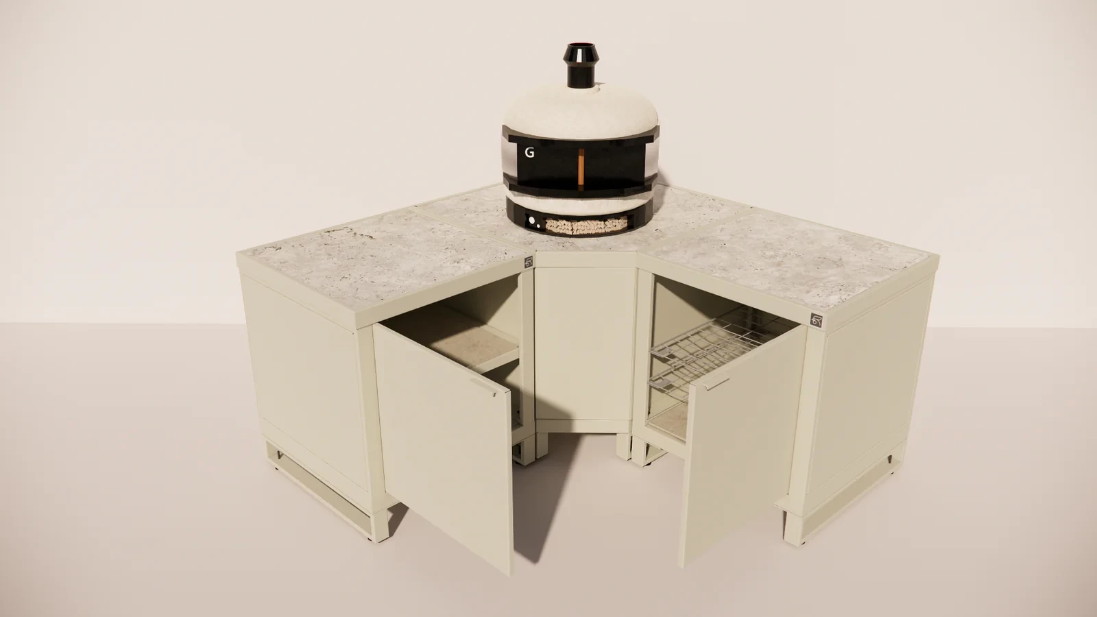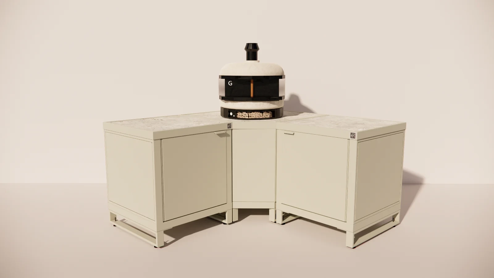 Het robuuste Rubix Corner Frame vormt het hart van de keuken, met voldoende ruimte voor een grote kamado of pizzaoven. De twee Single Frames bieden extra werk- en opbergruimte, waardoor je alles binnen handbereik hebt tijdens het koken.