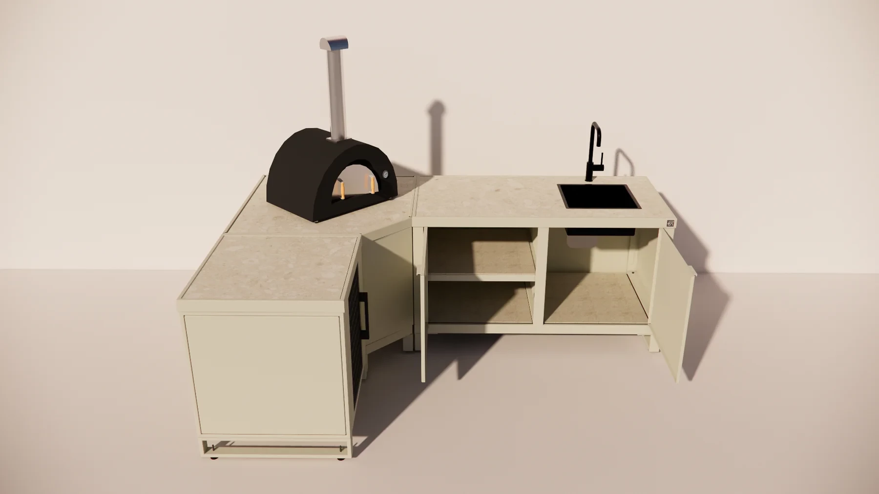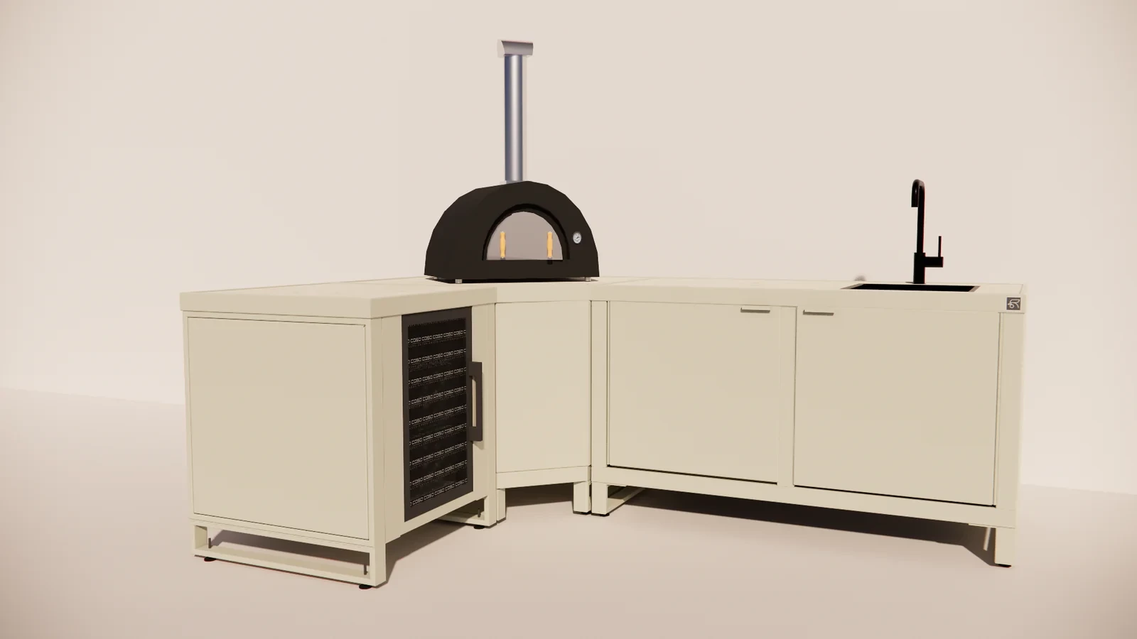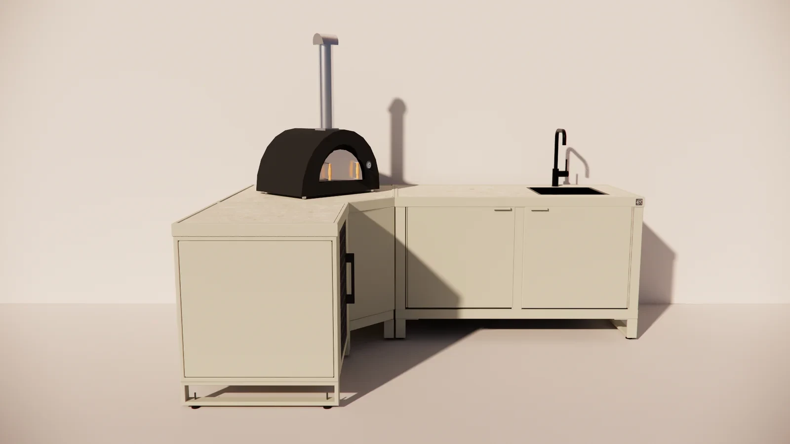 Het Corner Frame vormt het hart van de keuken en biedt ruimte voor een grote kamado of pizzaoven van merken als Gozney, Alfa of Ooni. De Single module zorgt voor extra werkruimte of opslag, terwijl de Duo module plek biedt voor een spoelunit, koelkast of extra grillgedeelte. Zo ontstaat een perfect uitgebalanceerde buitenkeuken, geschikt voor zowel compacte terrassen als ruime tuinen.
