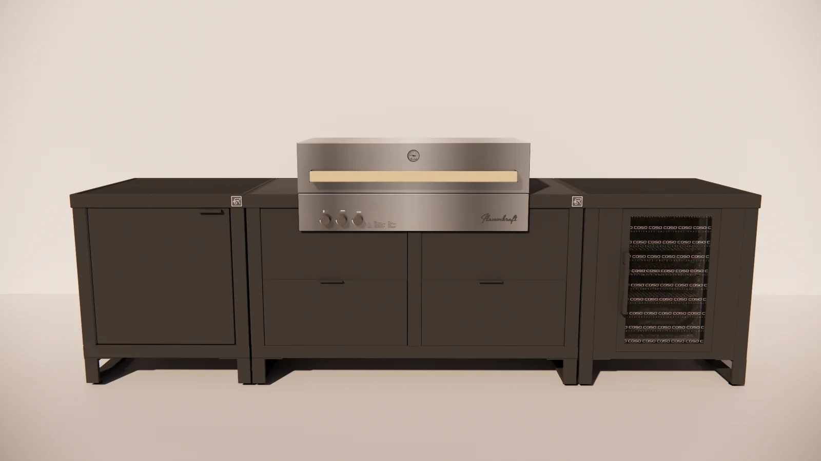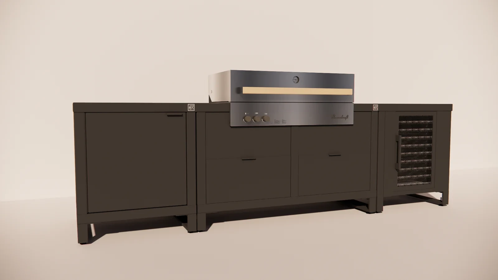 Het hart van de opstelling wordt gevormd door het Duo Gas Frame, uitgerust met een krachtige gasbarbecue die direct reageert en zorgt voor perfecte controle over de temperatuur. Aan weerszijden bieden de twee Rubix Single modules extra werk- en opbergruimte, waardoor je altijd overzicht en comfort behoudt tijdens het koken.