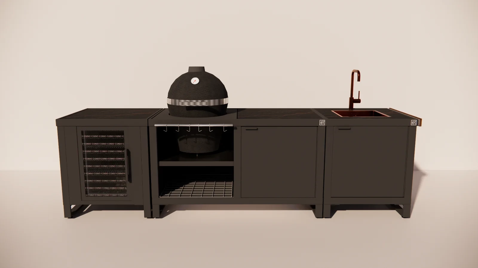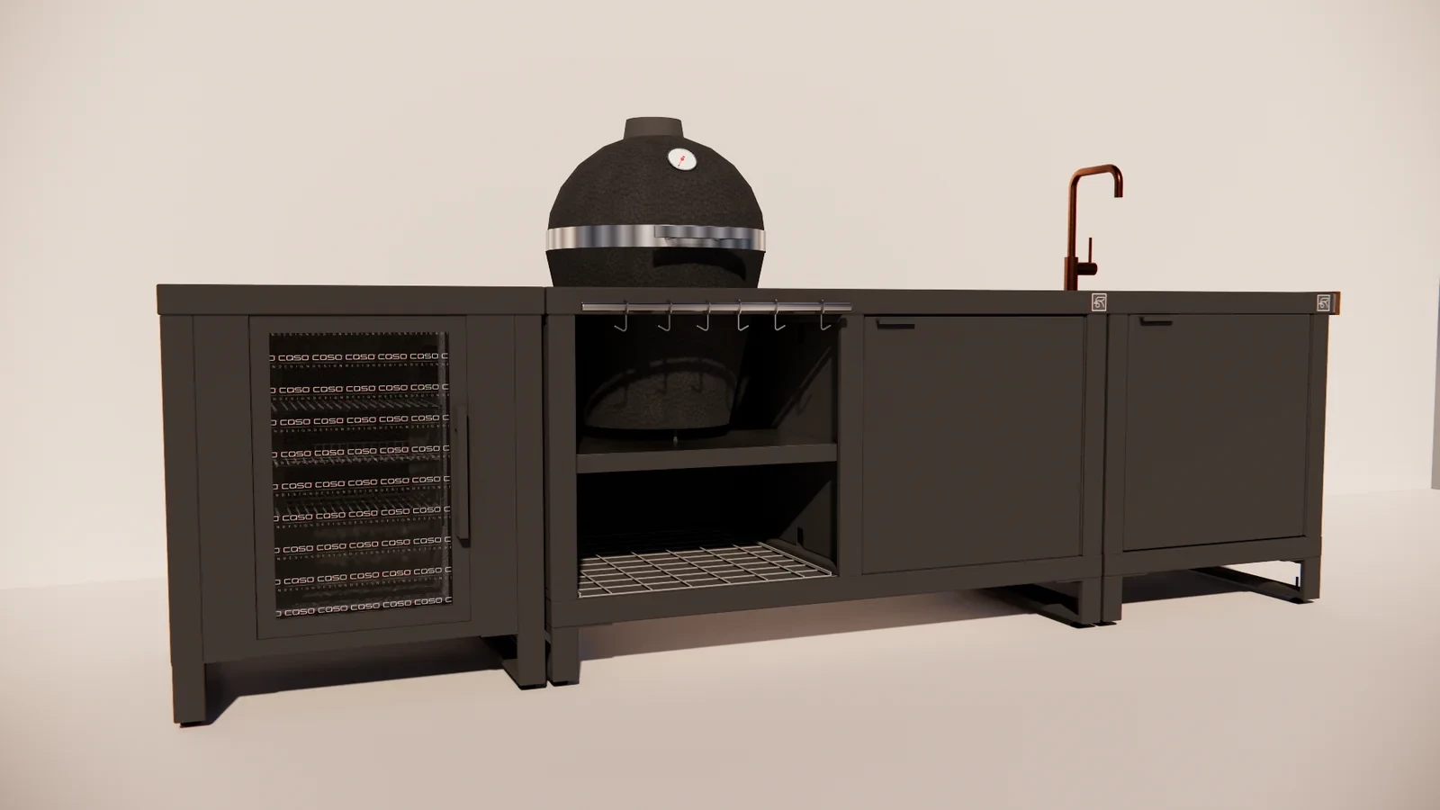 De Roostr Kamado – Opstelling 3 Rubix Single met Koelkast, Duo met Kamado en Single met Spoelbak is het toonbeeld van compleet buiten koken in stijl. Deze indrukwekkende buitenkeuken uit de Roostr Rubix-lijn combineert drie functionele frames tot één harmonieus geheel:
