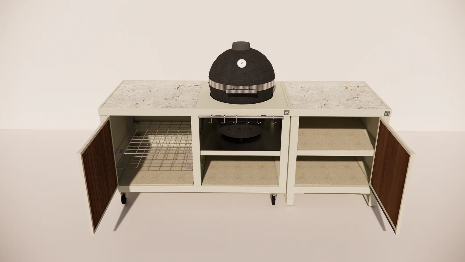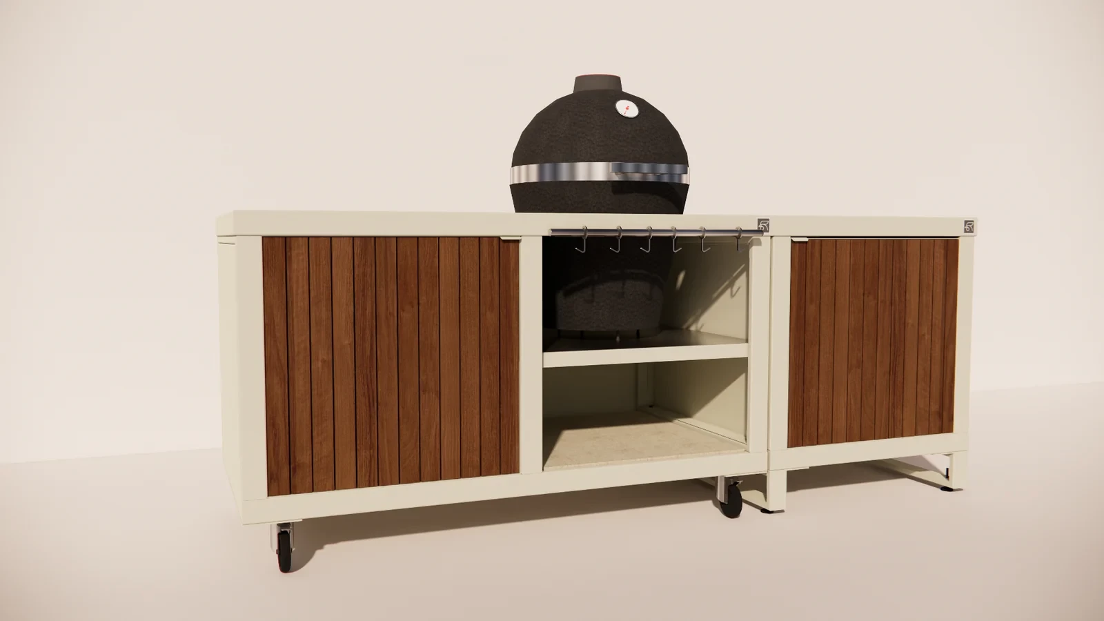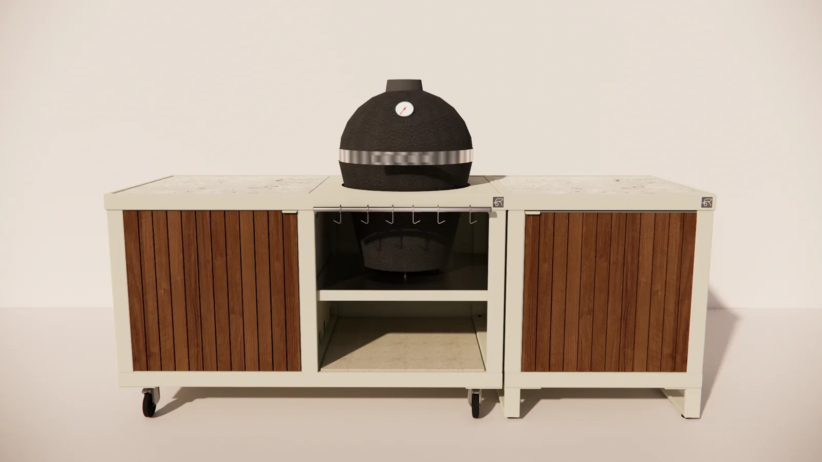 De Rubix Duo vormt het hart van de buitenkeuken en biedt ruimte voor een kamado waarmee je kunt grillen, bakken of slowcooken. Naast de kamado bevindt zich een Rubix Single met houten deuren, perfect voor het netjes opbergen van accessoires, houtskool of kookgerei.