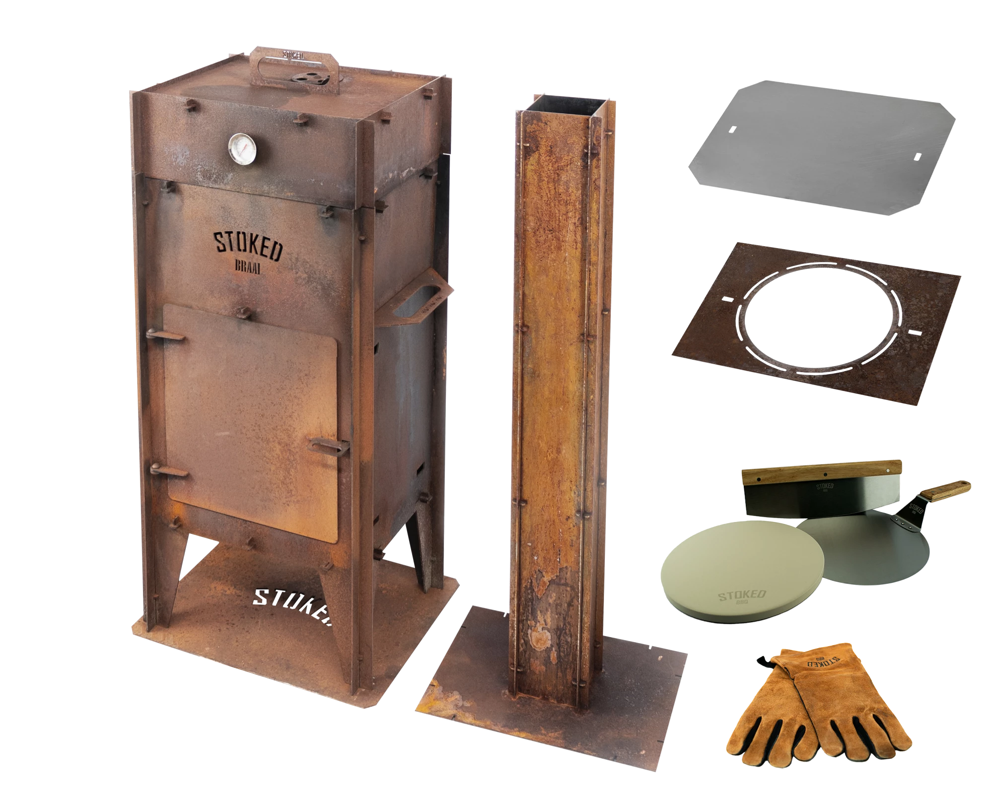 De STOKED Braai Premium is het meest complete model binnen de STOKED-serie en combineert stoer design met eindeloze mogelijkheden voor buiten koken. Deze multifunctionele barbecue, tuinhaard en pizzaoven in één is vervaardigd uit 3 mm dik CorTen staal (met een 2 mm dik deksel en schoorsteen) en is bestand tegen weer en wind, het hele jaar door.