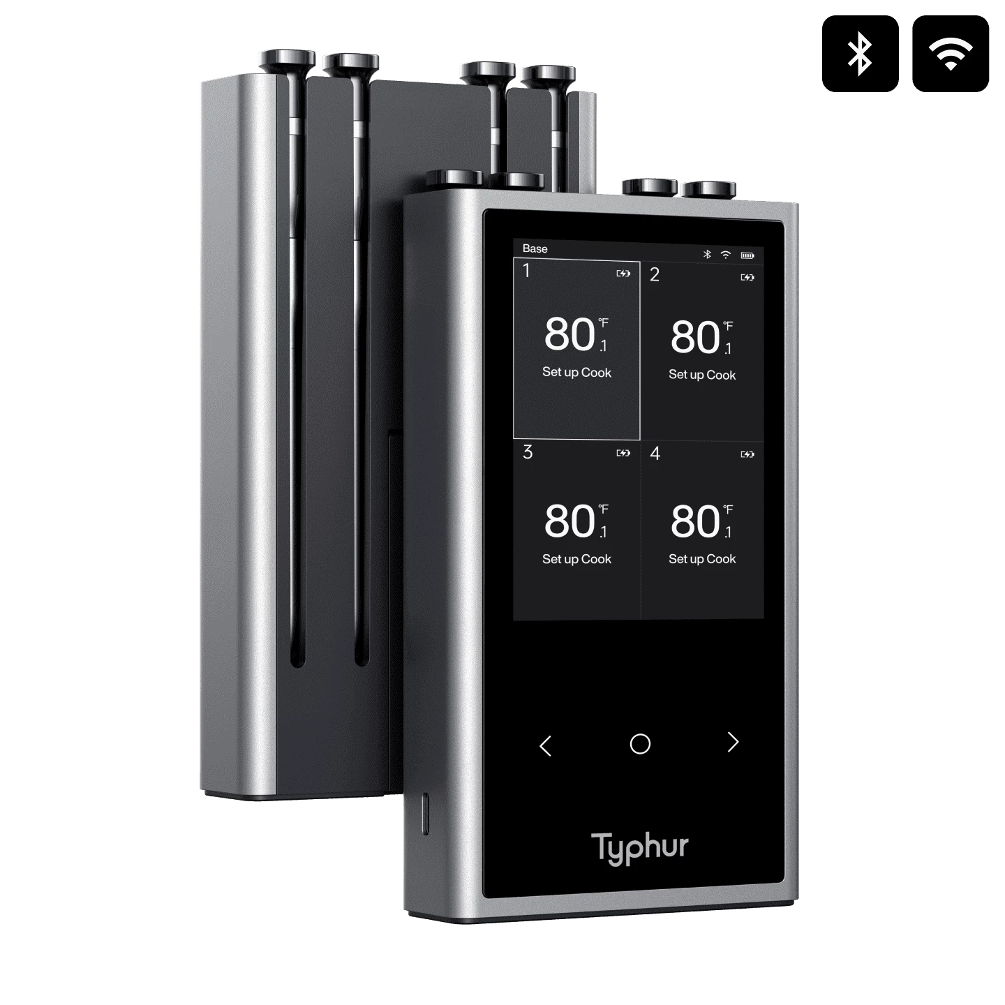 De slimme Smart Base fungeert als laadstation, WiFi-bridge én overzichtelijk temperatuurdisplay met een helder 2,4″ scherm. Je hebt realtime inzicht in alle metingen, rechtstreeks op de basis of via de app. Met een batterijduur tot 50 uur per lading is de Typhur Sync Quad perfect voor lange sessies en uitgebreide maaltijden.