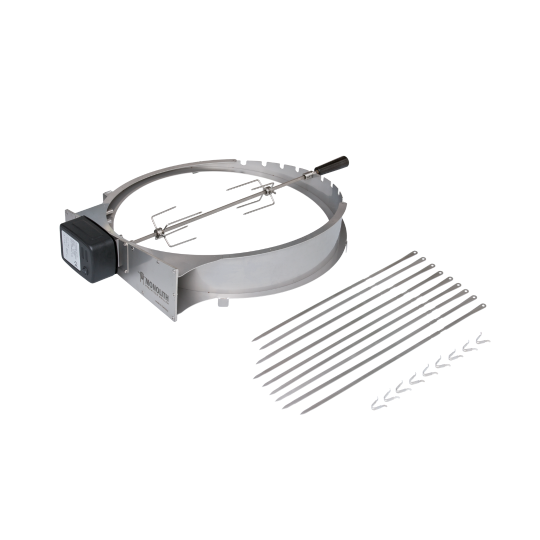 De rotisserie wordt aangedreven door een betrouwbare motor die zorgt voor een constante rotatie. Zo hoef jij alleen maar achterover te leunen terwijl de Monolith het werk doet. De negen roestvrijstalen spiesen draaien synchroon mee, waardoor elk stuk perfect gaart. Na gebruik zijn de spiesen eenvoudig schoon te maken dankzij het duurzame, gladde RVS-oppervlak.