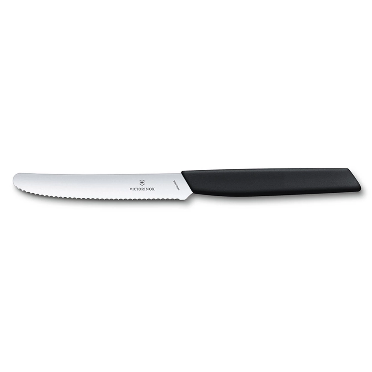 De Victorinox Swiss Modern Tomaten-/Tafelmes Set combineert precisie, comfort en stijl in één praktische set van twee messen. Met een lemmet van 11 cm en een scherp, gekarteld snijvlak snijd je moeiteloos door tomaten, fruit, steak of andere delicate ingrediënten.
