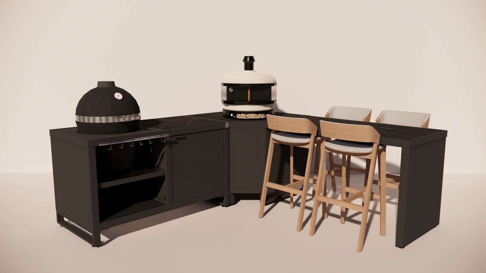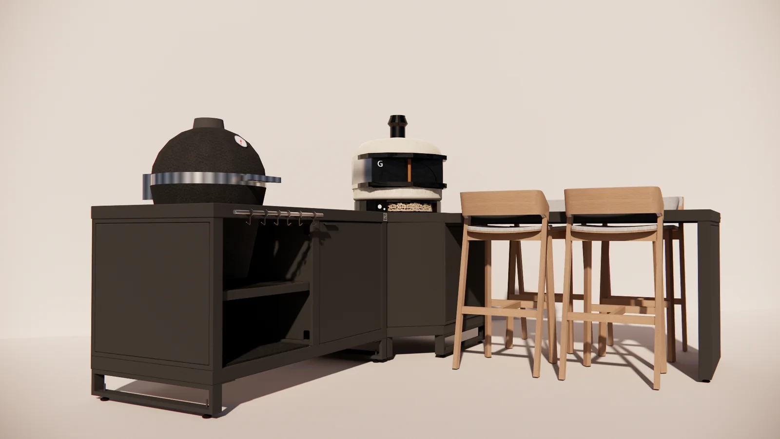 Het robuuste Rubix Corner Frame vormt het middelpunt van de keuken en verbindt de Duo module met een baropstelling voor vier personen. Zo heb je alles binnen handbereik om te koken, serveren en genieten met familie of vrienden. Dankzij de slimme hoekconstructie benut je de beschikbare ruimte optimaal – ideaal voor compacte terrassen, maar ook een stijlvolle blikvanger in grotere tuinen.
