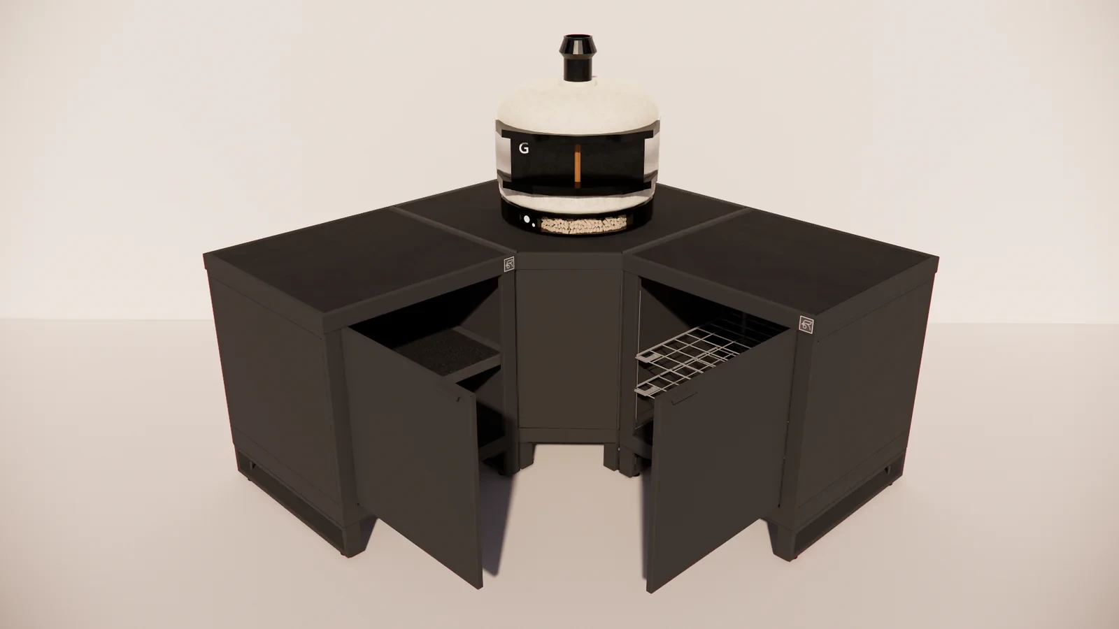 Het ontwerp biedt voldoende ruimte voor een grote kamado zoals de Big Green Egg XL of XXL, maar ook voor een pizzaoven van Gozney, Alfa of Ooni. De twee Single Frames zorgen voor extra werkruimte en opbergmogelijkheden, waardoor je tijdens het koken alles binnen handbereik hebt.