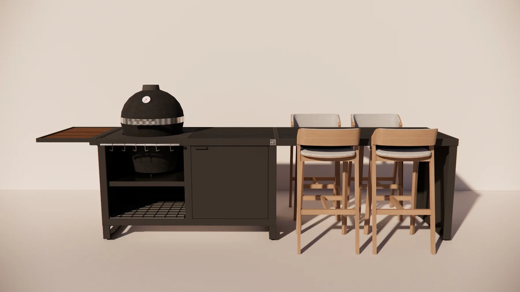 De Roostr Kamado – Opstelling 4 Rubix Duo met Kamado en 4-Persoons Bar is de perfecte buitenkeuken voor wie koken en samenzijn wil combineren. Deze stijlvolle opstelling uit de Roostr Rubix-lijn bestaat uit een Duo Frame met geïntegreerde kamado en een ruime baropstelling voor vier personen – ideaal voor diners, borrels of ontspannen momenten met familie en vrienden.