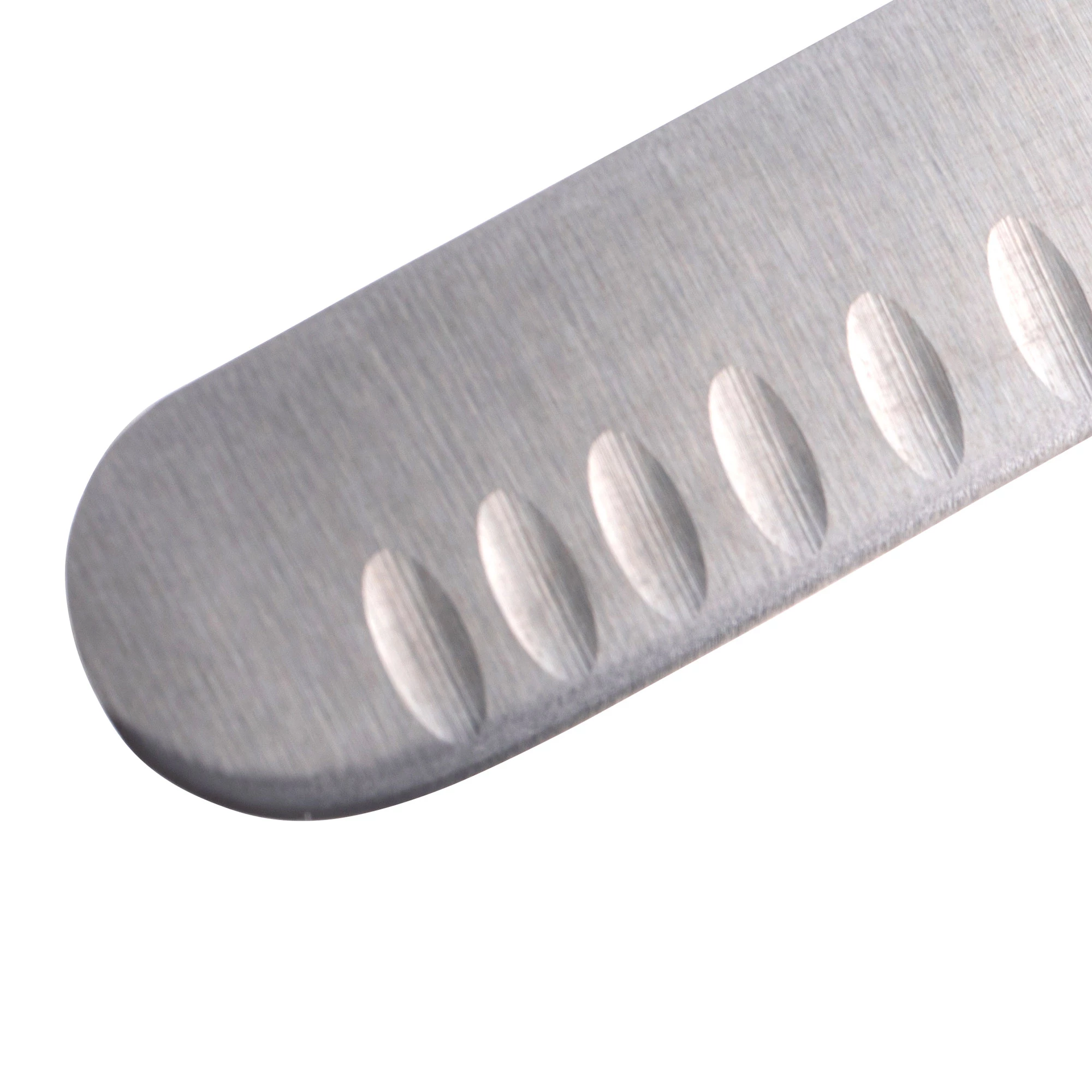De afwisselend uitgefreesde Granton-kuiltjes langs beide zijden van het blad verminderen wrijving en voorkomen dat het vlees aan het mes blijft kleven. Zo snijd je met een enkele, gecontroleerde beweging gelijkmatige plakken vlees, zonder verlies van sappen of structuur.